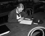 Cynthia Brants, at the ready writers' contestant in the Interscholastic League literary contests. She can be seen seated in a desk writing, a bottle of ink is to her left, she seems concentrated in her writing. She has a hat in front of her paper.