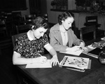 Ruth Carter, left, and Elizabeth Matthews,right, can be seen at the spelling contest, they are both seated at a desk, with pen in hand and writing. Ms. Carter is wearing a patterned dress and Ms. Matthews is wearing a coat and blouse.