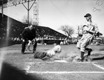Fort Worth Cats vs. Boston Red Sox baseball game. Dominic Di Maggio slides safely across the plate.