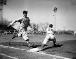 Fort Worth Cats vs. Boston Red Sox baseball game. Bobby Doerr of the Boston Red Sox and Cats third baseman Skipper Les Burge.