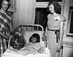 Jeanette Pryor, 6, patient at Fort Worth Children's Hospital, receiving an Easter basket presented by the Y-Teen Club of William James Junior High by Rheaetta Cannon, left, and Lula Faye Lane.