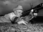 L. C. Turner, using telescopic sight to line up target in the Southwest rifle matches. He is lying on his stomach on the grass.