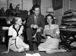 Sarah Lawrence College President Harold Taylor is discussing future plans with graduates (from left) Miss Cynthia Brants of Fort Worth and Miss Emily Morton, Saratoga Springs, New York. Both women, both wearing dresses, are seated on the floor and have papers in their hands. Dr. Taylor sits on a chair between them wearing a suit and tie; everyone is smiling. There is a sculpture on display on a table behind the group. To their left is a small table piled high with books and papers. Ms. Brants went on to have a career as a painter and was a member of the Fort Worth Circle of artists.