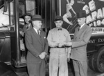 At the Railway Express Agency merit award ceremony are L.R. Weeks (behind the wheel) and Zack Godwin, receiving the award from Doctor W. J. Danforth and C. I. Jackson.