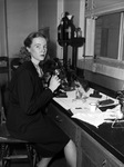 Doctor Helen Reller Gottschalk, director of the staff of the new Tumor Clinic in Fort Worth, Texas, at the City-County hospital. Doctor Gottschalk is wearing a dark blouse and skirt and is seated at a desk that is covered with lab equipment.