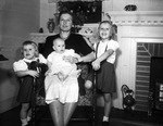 Mrs. Jack Gafford, of Harvard, Illinois, and her children, Maureen Gafford, left, Frances Gafford, right, and Nancy Gafford (infant). Mrs. Gafford is seated and holding Nancy in her lap. Maureen and Frances are standing on either side of their mother.