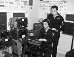 Naval Reserve radio operators Joe Allison, standing, Yoeman First Class, and Joe Kuykendall, Radioman Third Class. Kuykendall is sitting at the radio and Allison is standing behind him. Both are wearing their Naval uniforms.