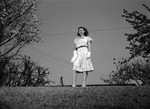 Pricilla Thomason, daughter of Doctor and Mrs. T. H. Thomason, a student at the University of Texas. Miss Thomason is standing outdoors, wearing a floral print dress and gloves. She is holding a hat in her right hand and is wearing high heels. On either side of her are several trees.