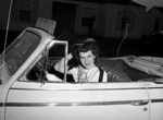 Miss Kathryn Ann Baker, daughter of Mr. and Mrs. E. L. Baker, who attends the University of Texas. Miss Baker is sitting in the driver's seat of a car smiling, with her right hand on her head and the other on the wheel.