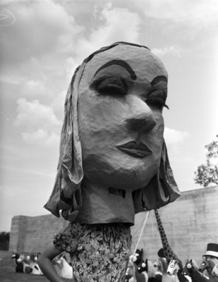 Recreation Department outdoor circus. Large paper-mache figures made by children of the Fort Worth Playgrounds along with 35 other gigantic figures of a more forbidding appearance. Image is a large paper-mache figure of the cousin of Queen's birthday present. Published in Fort Worth Star-Telegram evening edition August 13, 1940.