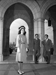 Students; Siblings; Richardson, Peggy; Richardson, Bob; Richardson, Dick; Richardson, J. J. (Dr.); Richardson, J. J. (Mrs.); Arches; Dresses; Gloves; Universities & colleges; Texas Christian University (T. C. U.); Texas State College for Women; Architecture