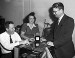 Mr. and Mrs. Grady Swindle, of Dublin, Texas, both with disabilities, talking with James Hillis (right), Fort Worth, Texas, vocational counselor. Mr. and Mrs. Swindle are sitting at a desk across from Mr. Hillis. Mrs. Swindle, is seen to be wearing a dress, and under her arms, are her crutches. Mr. Swindle is wearing a long sleeve white collared shirt with a striped tie. Mr. Hillis is wearing a black suit, with a collared shirt, and a tie.