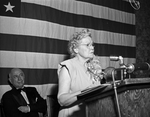 18th Annual Golden Deeds Banquet held in honor of Lena Pope. Mrs. Pope was honored by the Fort Worth Exchange Club as the city's outstanding citizens of 1946. She is seen standing at a podium, speaking to the crowd at the banquet, held at the Fort Worth Club. Amon G. Carter is seen seated just behind her. Mrs. Pope is president and supervising head of the Lena Pope Home for children.