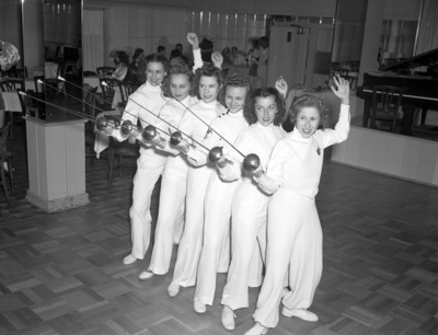 Hotel Texas Den floor show featuring "The Royal Assassins," The six fancy fencers are (left to right) Connie Nagle, June Douglas, Merle Montgomery, Harriet Knight, Karolyn Dowler and Jimmie Myer.