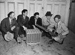 R.B. Hickerson, College Station, Texas (right) is demonstrating a farm drier and elevator at Northwoods Stock Farm to (from left) Sam Mclean, Harold Law, Ellis Bishop, and M. M. Lasater, of Haslet, Texas.