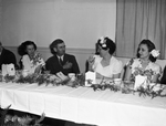 Miss Bertie Mae McDonald (second from right), interpreter to the deaf at Fort Worth's Broadway Baptist Church, using sign language with Albert Tully (second from left), president, during an annual banquet for people who are deaf and mute. A woman is seated beside Tully and another woman is seated on the other side of Miss McDonald.