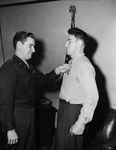 Captain John R. Beneventi, left, pinning the Bronze Star Medal on Hewitt C. Laird, of Haslet, Texas, for "Heroic achievement" while with the United States Army in Germany. Captain Beneventi is wearing a military uniform and Laird is wearing a long-sleeve shirt and trousers.