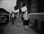 Three pickets strolling around the main exchange and business office buldings during a telephone company strike.
