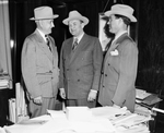 Standing left to right: Amon Carter, United States Senator George W. Malone and Sam Pace. They are all wearing suits and hats. Mr. Pace is also wearing eyeglasses. In the background is a framed photograph on the wall and tables with documents and other miscellaneous items.