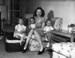 Mrs. Walten H. McKenzie and her young children, Jimmie McKenzie, Jerry McKenzie and Susan McKenzie. Mrs. McKenzie is sitting in a chair and is holding Jimmie on her lap. Susan is sitting on an ottoman at the left and Jerry is sitting on the other side of his mother. Susan is two-and-a-half years old, and Jerry and Jimmy, twins, are one-and-a-half years old. The picture was taken in their living room, a fireplace, chair, and a window can be seen in the background. There is a coffee table to the right side of Jimmy, that has a flower pot on top. The twins appear to be wearing overalls with short sleeve collared white shirts, Mrs. McKenzie is wearing a dress, black high heels, and a necklace; Susan is wearing a white dress.