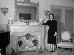 Mrs. Cameron E. Shropshire in the living room of her new home. She is standing beside the fireplace, wearing a dark long-sleeve dress. There is a lot of embellished candle holders on the wall, and above the fireplace there is a mirror.