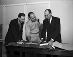 (From left) N. T. Underwood, Coleman Chamber of Commerce manager, Lee R. Wilson, resident engineer, and H. H. Scott, Coleman, Texas, city commissioner, tracing the shoreline of the Hord's Creek Reservoir under construction on a blueprint that is laid out on a table. Underwood and Scott are wearing suits and Wilson is wearing a long-sleeve shirt and trousers.