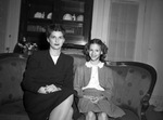 Mrs. Norman S. Kent and her daughter, Kay Sonnell Kent, sitting on a couch. Mrs. Kent was elected president of the Clio Club, to succeed Mrs. Staley T. McBrayer. Kay is 10 years old. Kay and her mother are both wearing blouses with dark skirts and blazers. Behind them is a large wooden cabinet filled with books and decorative porcelain tableware.