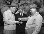 Comanche County's "Legume Field Day" which they claim to produce more peanuts than any other county in the nation. Participants (from left) W. L. David, Corsicana, Texas; Howard Kingsbery, Santa Anna, Texas, and V. L. Cade, Lubbock, Texas. They are standing outdoors and Cade is pouring a small packet of seeds into David's hands. Mr. David and Mr. Cade appear to be wearing sweaters, Mr. Kingsbery who is wearing a coat, but they are all wearing hats.
