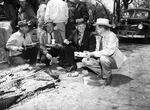 Comanche County's "Legume Field Day" participants (from left) R. H. Nelson, Charles Marshall, Pat Cagle and E. L. Pierson. The men are outdoors, sitting on the ground, there is a pile of burned wood to the left which appears to be from a bonfire. They each have a plate of food on their lap. There is a car in the background.