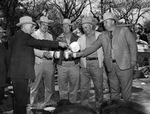 Comanche County's "Legume Field Day" participants (from left) T. N. Burton and his sons, Bob Burton, R. W. Burton, Tom Burton and J. H. Burton. The men are standing outdoors; T. N. Burton is pouring each of his sons a cup of coffee.