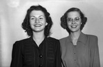 Knights of Columbus Pioneer Carnival queen contestants Jeanne Johns (left) and Edith Kelly. The young women are standing against a blank wall, both wearing dresses. Miss Kelly is wearing eyeglasses.