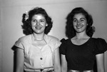 Knights of Columbus Pioneer Carnival queen contestants, Jo Marie Imber (left) and Myrtle Reynolds. The young women are standing against a blank wall, looking slightly to the left. Miss Imber is wearing a dress with a v neckline, a pearl necklace, and has a flower in her hair. Miss Reynolds is wearing a dark blouse and a skirt.