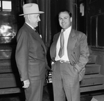 Amon Carter (left) and his son, Amon Carter Jr. Both men are wearing suits. Carter Jr. has his hands in his pant pockets and is facing the camera. Carter Sr. is facing his son.. They are standing in front of a train.