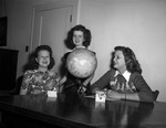 Y-Teen Club members (from left) Miss Noel Echols, Miss Shirley Bothe, and Miss Jo Ann Bagaley, planning decorations for the annual mother-daughter banquet. Miss Echols and Miss Bagaley are sitting at a desk and Miss Bothe is standing between them. On the desk is a globe. Miss Echols and Miss Bothe are both wearing a dress and Miss Bagaley is wearing a sweater and a collared shirt under.