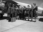 Volunteers of America members (from left) Lieutenant Captain J. F. Fuller, Houston, Texas; Lieutenant Major Henry Sharp, New Bedford, Massachusetts; Lieutenant Major Anna Mae Higgins, Toledo, Ohio; Major Ira E. Notle, Madison, Wisconsin; General Maud B. Booth, New York, New York; Lieutenant Colonel Jeanette Spencer, Omaha, Nebraska; Major Lillian Gould, Des Moines, Iowa; Major Virginia Dodson, Seattle, Washington; Adjunct Millie Fuller, Houston, Texas, and Lieutenant Colonel Ida M. Spies, Fort Worth, Texas. The members are lined up in front of a plane, all wearing their uniforms. The volunteers held their 51st annual national convention in Fort Worth, Texas, and were bound for Texas City, Texas, where they offered their services as welfare workers.