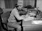 D. Burns, manager of the Pitchfork Ranch at Dickens, Texas. Burns is sitting at a desk, writing on a piece of paper. Burns is wearing a coat, trousers, cowboy hat and eyeglasses.