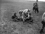 D. Burns putting the brand on a calf with help from a group of cowboys during branding season at the Pitchfork Ranch, at Dickens, Texas. The calf is being held still by three men while Burns places the brand.