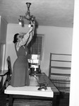 Red Cross accident prevention course model demonstrating a common method of electrocution. The woman is kneeling on top of a table, holding the electrical plug of an iron against an unscrewed light bulb from the light fixture above her. The model is wearing a dress over a long-sleeve, striped blouse.