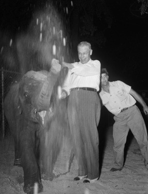 The Forest Park Zoo's newest baby elephant is being welcomed by Park Superintendent Harry Adams. She nodded her acknowledgement but went right on with what she was doing - spraying her back with cool, damp sand. She was right at home in two minutes. Mr. Adams is wearing a dress shirt and striped trousers. Assistant zookeeper Julian Frazier is standing in the background holding the elephant's chain.