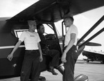 Paris, Texas, Air Scouts are shown with Leader Jess Faulkner (center) by the Stinson Voyager in which they flew from Paris, Texas, to Fort Worth, Texas for the three-day bivouac at Fort Worth Army Air Field (FWAAF). Left is Cary Geron and right is Bobby Banister. Faulkner is sitting in the plane and Geron and Banister are standing beside him. Geron and Banister are wearing t-shirts that say "Paris" on the front and trousers. All are members of Paris Air Scout Squadron Number 8, made up of 13 members.