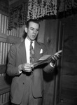 Carl Oliphant reading the Texas Agricultural and Mechanical College (A. & M.) Muster for the Fort Worth, Texas, chapter of the Ex-Students Association. He is wearing a suit with a necktie.