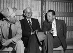 Texas Agricultural and Mechanical College (A&M) San Jacinto Day Muster attendees, (from left) Sinclair Baker, W. E. Baker, and H. E. (Buck) Cunningham. The men are sitting on a bench, all wearing suits. W. E. Baker is of the class of 1898 of the University of Texas. His son, Sinclair Baker, is Texas A&M ex-student. Mr. Cunningham is retiring president of the Fort Worth, Texas, chapter of the A&M Ex-Students' Association.