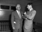 Associated Press state bureau chiefs Frank King, left, of Dallas, Texas, and Noland Norgaard, of Oklahoma City, Oklahoma, who are in Fort Worth, Texas, to address the Southwestern Journalism Congress. Both men are wearing suits. Norgaard is wearing eyeglasses and is holding a pipe in his left hand.