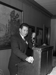 Dwight Bentel at the Southwestern Journalism Congress at Hotel Texas, Fort Worth, Texas. Bentel is standing behind a podium, wearing a suit. Hanging on the wall behind him is a large framed painting. He appears to be wearing a suit, white collared shirt, and tie.