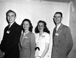 Texas Technological College students and Southwestern Student Press Club members (from left) Aubrey L. Shouse, of Merkel, Texas, Joyce Hendrick, of Olden, Texas, Mary Lou Spence and M. E. McClendon, both of Lubbock, Texas, at the Southwestern Journalism Congress held at Hotel Texas in Fort Worth, Texas. Aubrey and Mr. McClendon are wearing suits and Joyce and Mary Lou are wearing blouses and skirts. They are all standing in front of a wall, that has a white cloth clipped to it.