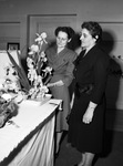 Mrs. J. L. Tracy (left), sweepstakes prize winner, and Mrs. V. S. Timpone, special award winner of the most outstanding arrangement at the Saint Mary's Garden Club annual spring flower show. Both women are wearing dresses. They are inspecting one of the flower arrangements at the show, which is on top of a table. There are a couple of wooden cabinets encrusted in the background wall.