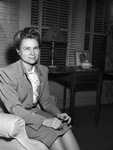 Mrs. Neil Boldrick, to represent Fort Worth, Texas, Kappa Gamma alumnae at the sorority's province convention in Austin, Texas. Mrs. Boldrick is sitting in an armchair, wearing a blouse with a ruffled collar, a blazer and skirt. There is a table behind her, that has a lamp, a candy vase, and a baby boy's portrait; the blinds of the window appear to be open.