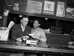 N. E. Huegel, left, new manager of Colonial Country Club, chatting with Assistant Professional Bobby Morris. The men are standing behind the Club bar, each holding a package of golf balls. Mr. Huegel appears to be wearing a striped suit, a white collared shirt, and a patterned tie. Mr. Morris is wearing a long sleeve plaid collared shirt.