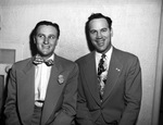 Junior Chamber of Commerce Convention attendees Price Crawley, of Ranger, Texas, left, and John E. Mangrum. Both men are wearing suits; Crawley is wearing a bow tie and Mangrum is wearing a necktie. Both are standing in front of a wall smiling.