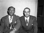 Junior Chamber of Commerce Convention attendee E. Lupkin, of Kilgore, Texas, left. The man at the right is unidentified. Both men are wearing suits and neckties and are sitting against a blank wall. The unidentified man is also wearing eyeglasses.